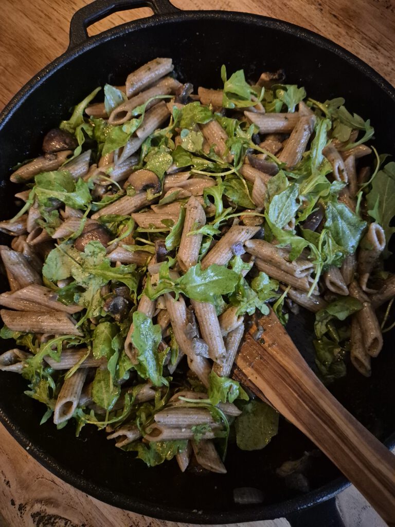 Volkoren penne met kastanjechampignons, rucola & pesto